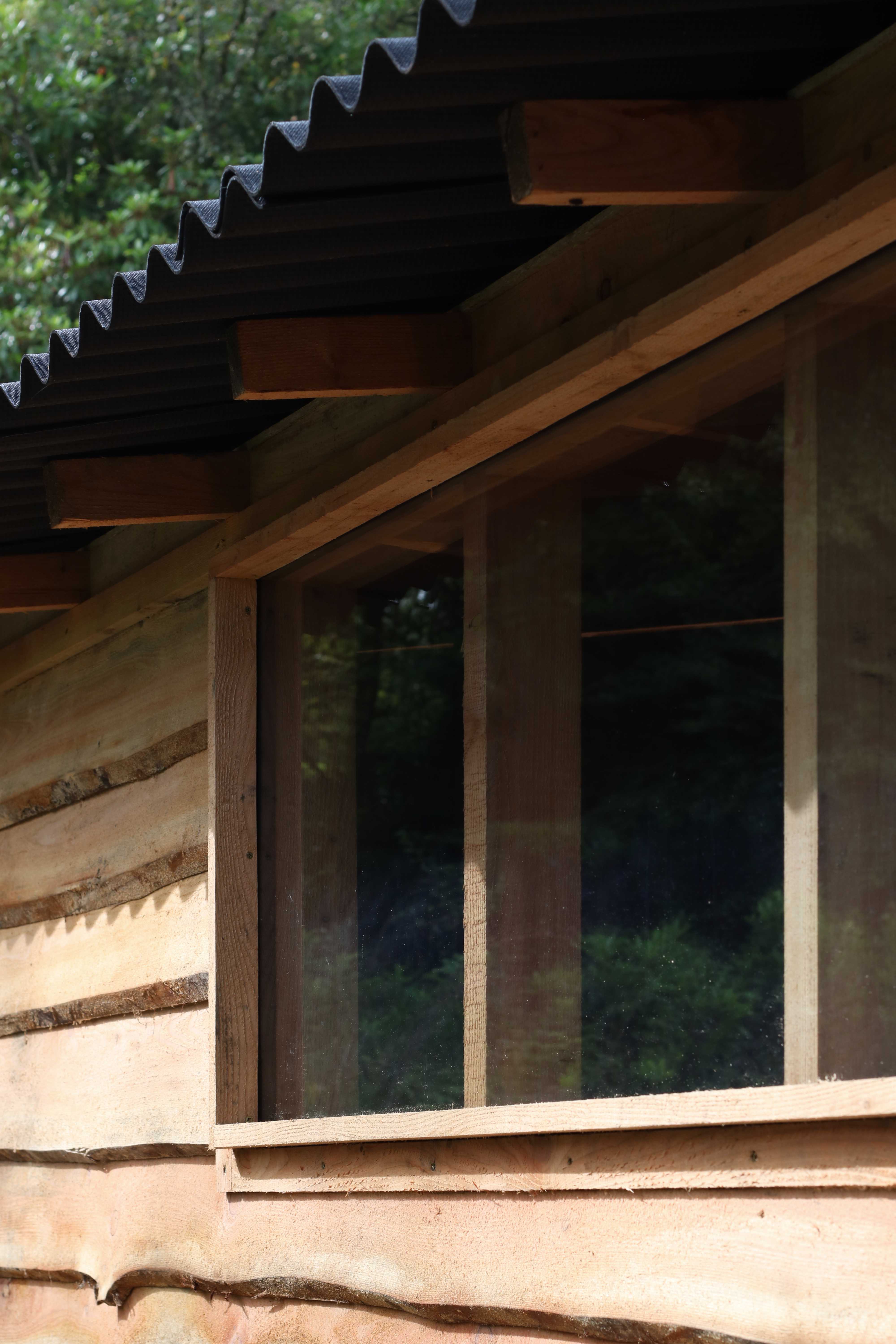 The timber structure and waney edged timber cladding is made of locally felled green larch. The larch was milled on site and to minimise waste the workshop was designed to best use of the timber available. A two metre wide window sits central to the workshop space, providing ample light for working and generous views out over the woodland. Set amongst a stand of young birch trees, the cladding will silver over time.